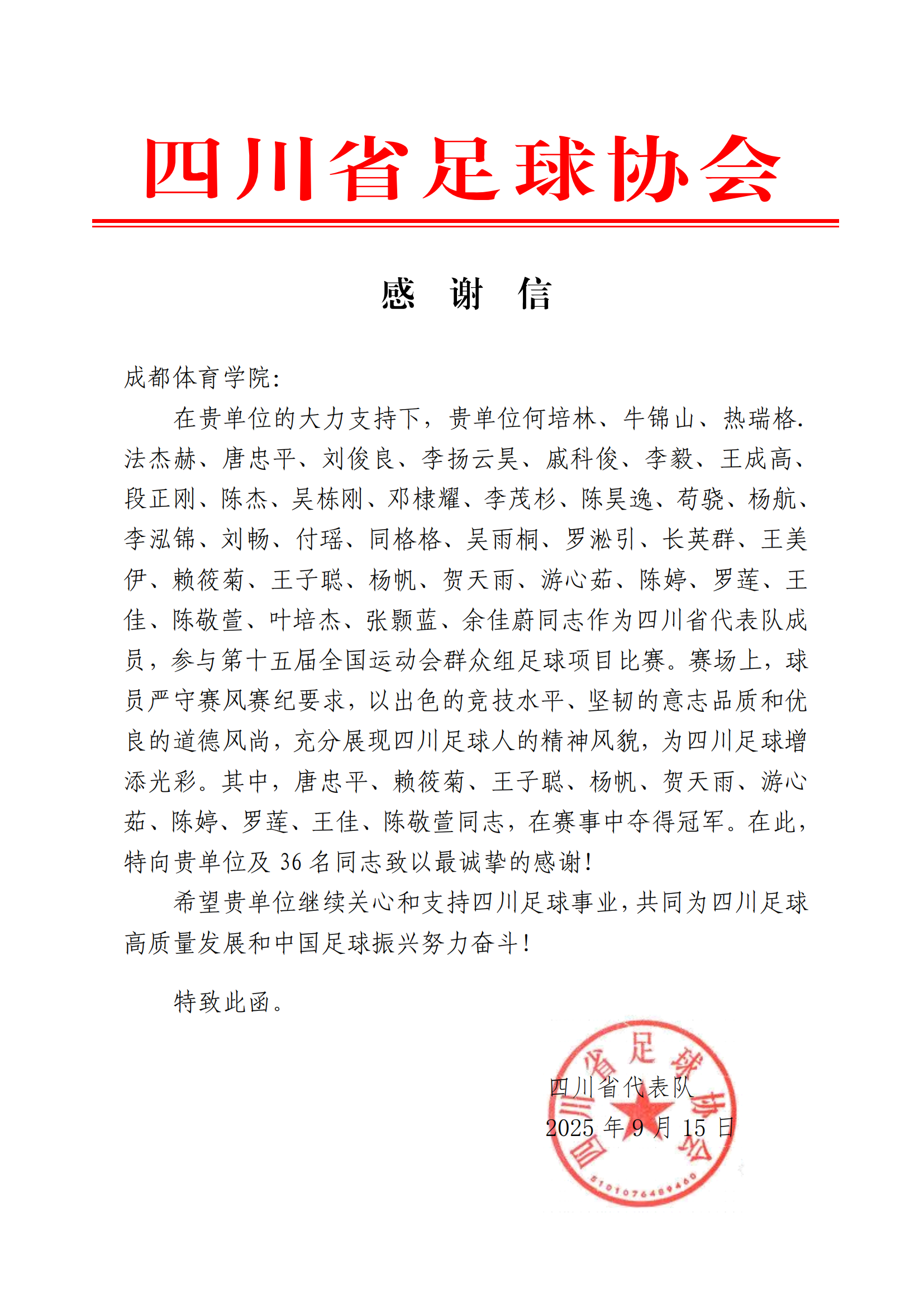 (永利yl23411集团官网入口)第十五届全国运动会群众组足球项目比赛感谢信