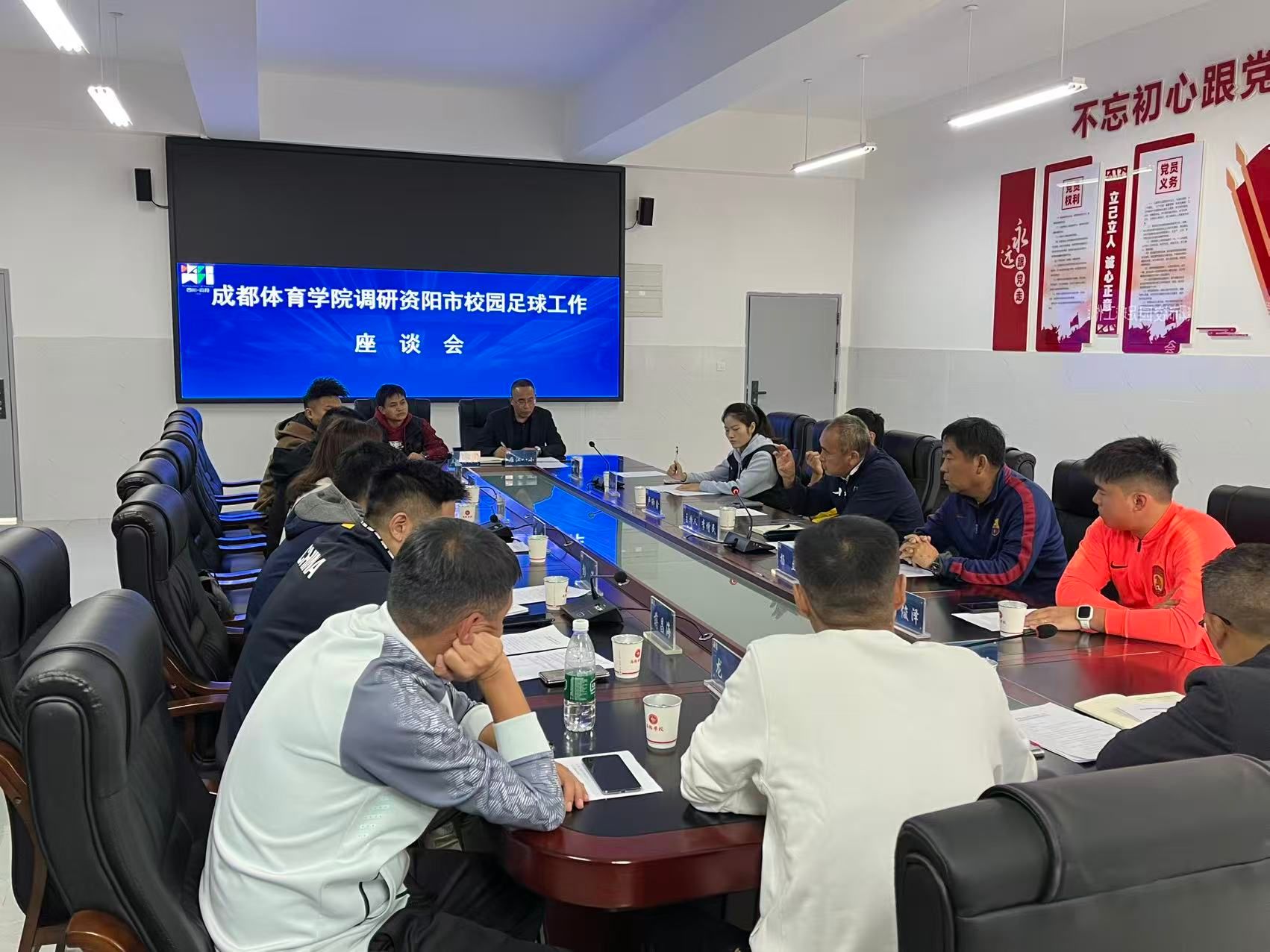 一行人先后走访了资阳市教体局、资阳市雁江八小、三贤九义校等公司,与当地教育部门及校领导、体育教师代表进行了座谈交流,重点围绕校园足球课程建设、训练体系构建、团队队伍发展、校园足球竞赛体系改革以及青少年体育人才培养衔接机制等方面进行了深入探讨。
